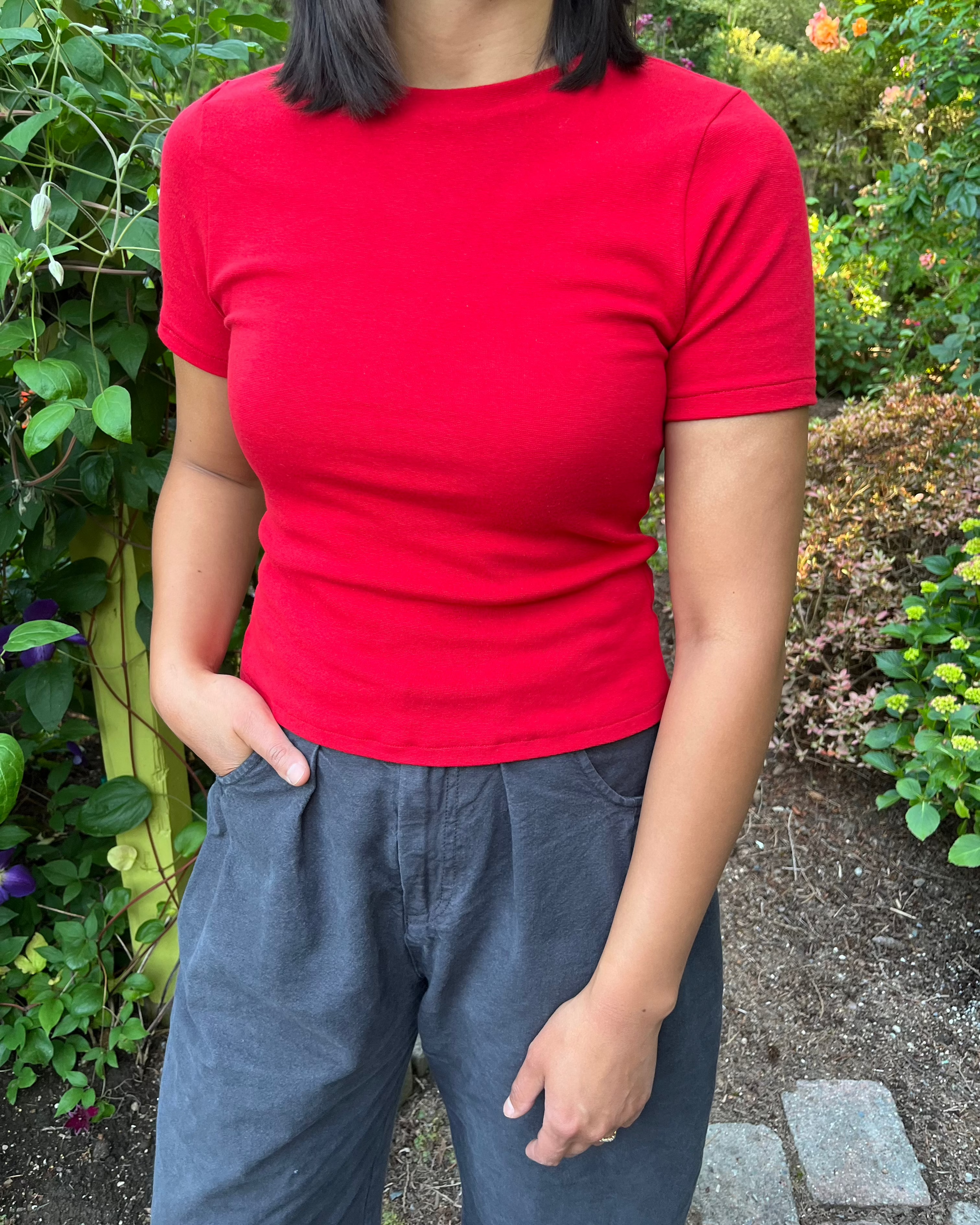 Red classic tee: Model is 5’8” (1.72m) wearing a size 6