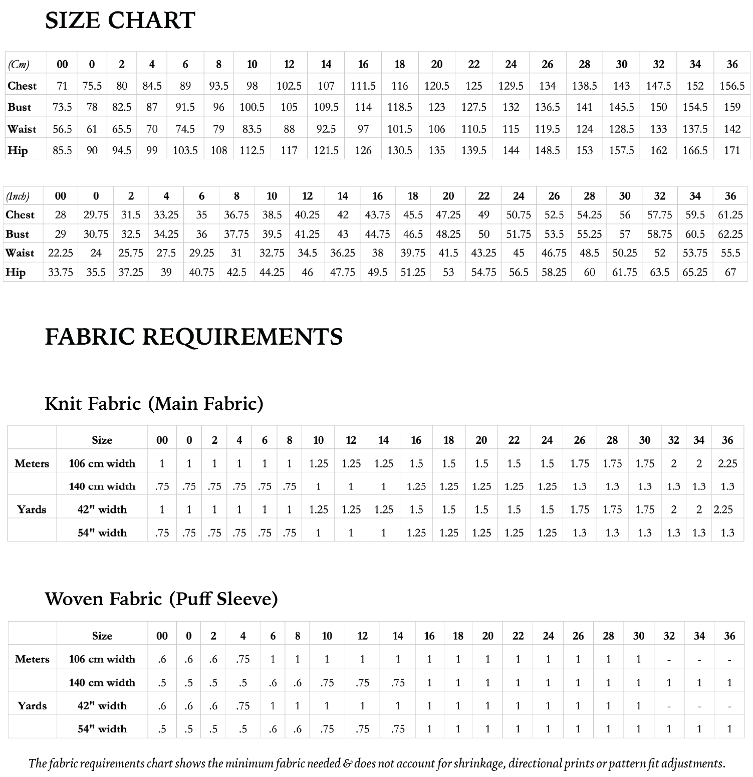 The Valencia pattern includes 2 views seen in the pictures above: puff sleeve top and a classic tee